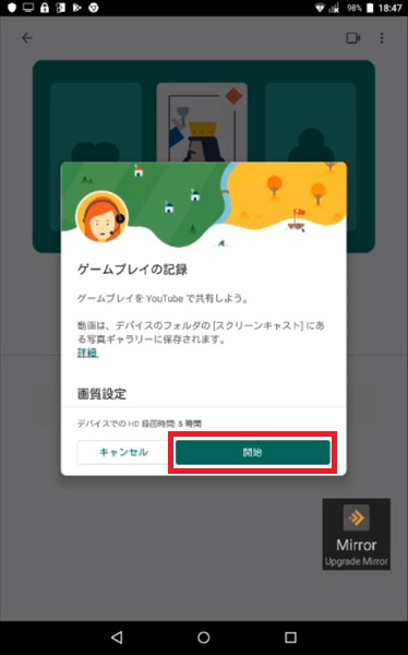 「ゲームプレイの記録」画面が表示されたら「開始」ボタンをタップします。