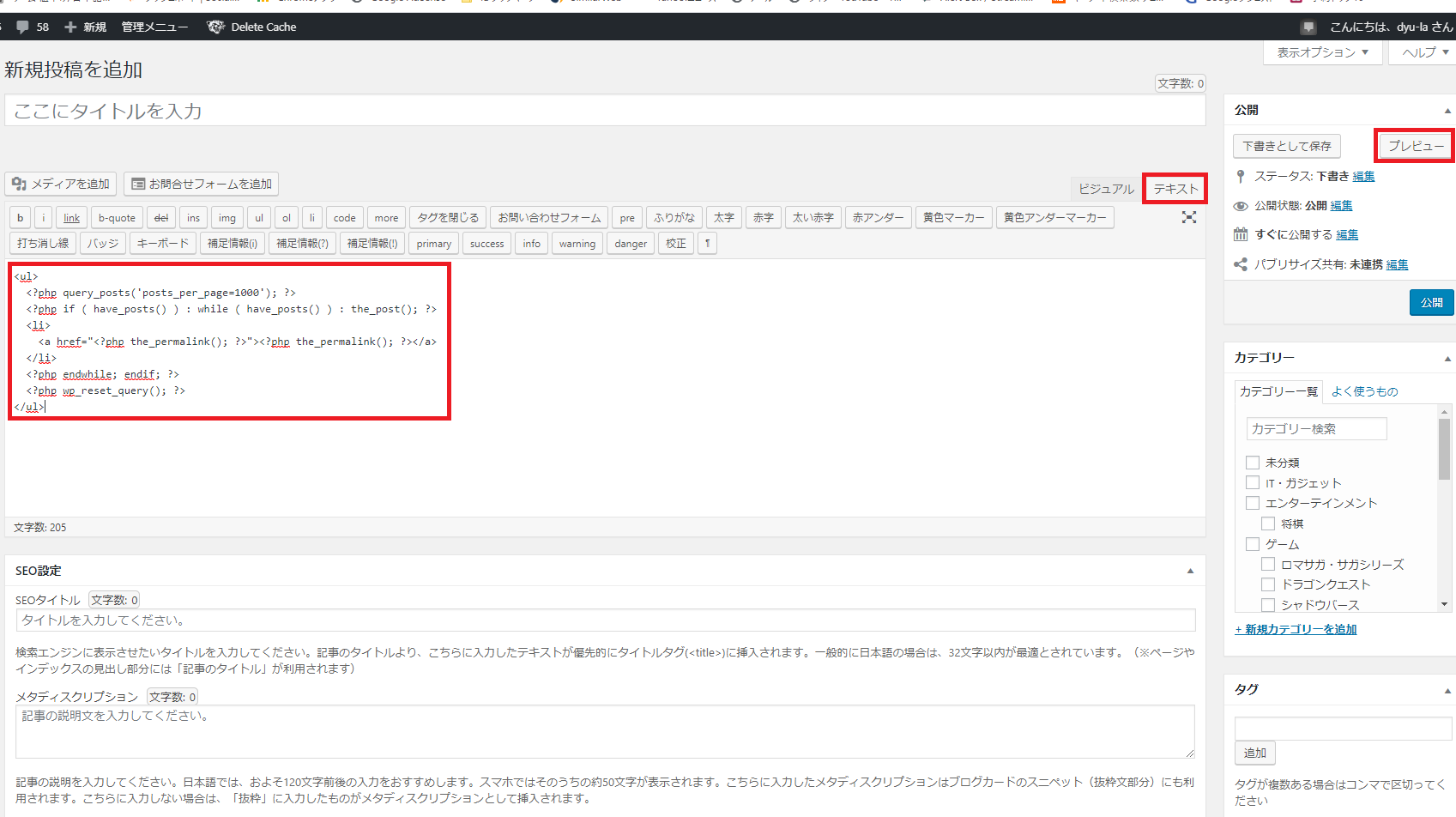 「新規投稿」の「テキスト」にリダイレクトする必要のあるコードを以下の中から選んでコピー&ペーストで貼り付けます。