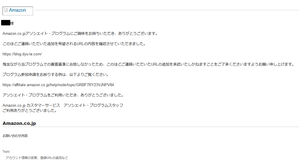 ちなみに私は6回申請して諦めました。画像を外したり記事を非公開にしたりと色々試したのですが、理由をメールで聞いても一切お答えできませんの一点貼りで、お互い審査に無駄な時間を過ごしているだけになってしまっている気がしたからです。