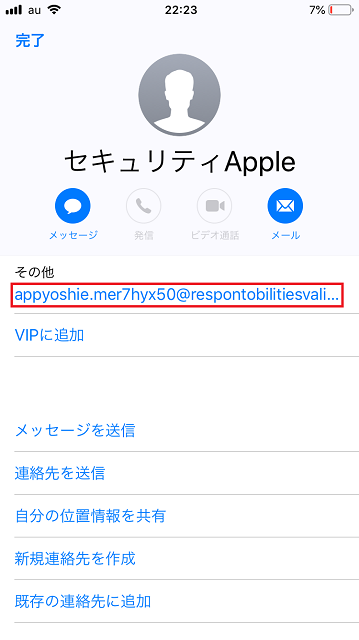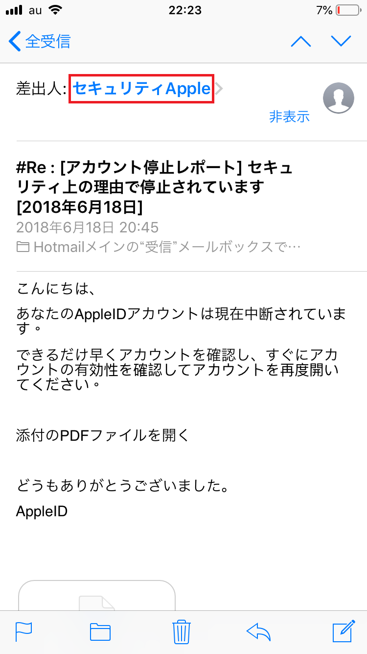 スマホではメールアドレスの表示がなく、送信者の名前のみが表示されています。一見すると本当にAppleから来たようにも見えますが、送信者の名前をタップするとメールアドレスが表示されます。