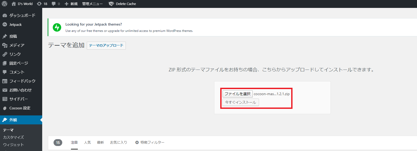 次にWordPress管理画面でCocoonをインストールしましょう。