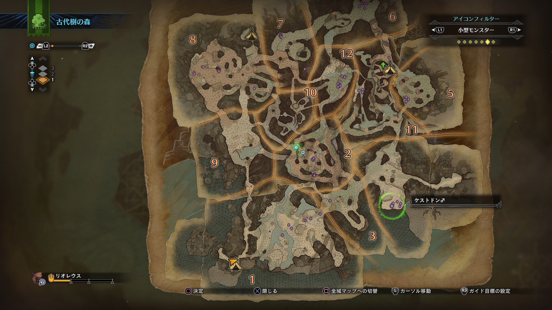 探索中に生態マップを開いた場合も調査拠点と同様、今いる場所の地図が表示される。